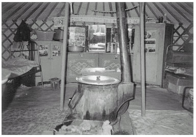 ゲルの戸口から見た正面奥。手前から燃料箱,カマド,