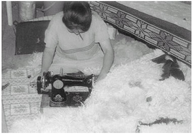 羊毛皮を用い,手回しミシンで民族服を仕立てる主婦。