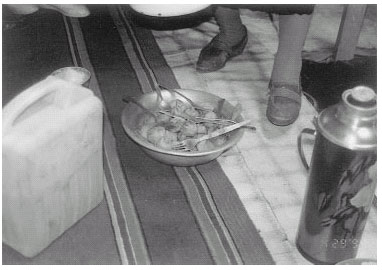 接客の際,床面に乳製品の盛り物なども置かれる。写真の中央は肉料理(ボーズ),