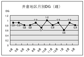 市内井倉地区5戸(飼育規模 5〜25頭)の肉用牛農家で人工哺育を行った103頭(内22頭が阿新北部地区からの受託牛)について,月別の平均1日あたり増体重(DG)の比較を行いました。