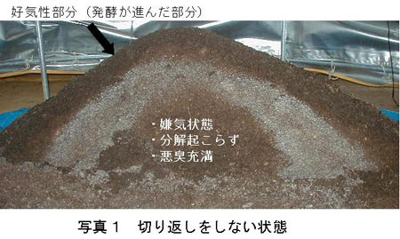 しかし,比重を調整しても,堆積しているだけでは,空気が通るのは,せいぜい表面から20〜30cm程度で,内部は,嫌気状態で分解はほとんど起きていません。(写真1)