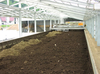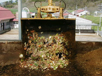 現在,総合畜産センタ−の堆肥化施設(写真2)では,バイオマス(生物由来の資源)の利活用のため,家畜ふんと地域からの生ゴミを一体的に処理することで,有機資源による地域リサイクルシステムを構築し,畜産業と地域との共存を図ることを目的に,畜ふん・生ゴミ混合堆肥の生産実証試験を行っています。(写真3)生ゴミは,畜ふんに比べて,栄養豊富で分解し易い有機物も豊富に含まれているため,年間を通じて良好な発酵をしていますので,関心のある方は,是非見学にお越し下さい。
