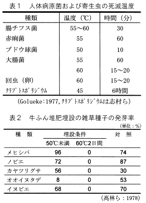 堆肥化過程の発酵温度をできるだけ高温になるように管理することが重要で,一般的に病原菌や雑草の種子を死滅させるには,60℃以上の高温に1週間以上さらされている必要があり,少なくとも堆積物の温度管理は常時行うようにして下さい。(表1・2)