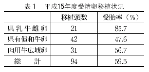 当家保が現在移植を実施している受精卵の種類を@〜Bに,平成15年度の移植頭数,受胎率を表1に示しました。