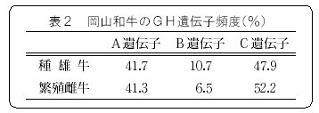 表2に県下の和牛のGH遺伝子型の頻度を示しました。雌雄ともAとCの遺伝子が多く,B遺伝子が少ないという特徴があり,特に雌牛の多くがC遺伝子を保有していることが分かりました。