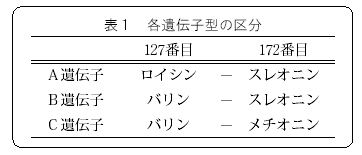成長ホルモンは文字通り,成長促進作用のあるホルモンで,タンパク質同化,脂肪異化,糖代謝などの機能があります。牛の成長ホルモン遺伝子(以下,GH遺伝子)には,いくつかの型があって,和牛においても127番目と172番目のそれぞれにアミノ酸置換を伴う遺伝子の多型が存在し,次の表1のようにABCの3種類に分けられます。