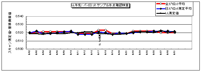 毎日のパイロットサンプルによる Scan 測定値の確認は,MilkoScan4200uw の運用の基本としての,LL牛乳の氷点測定値と当検査部で作成したパイロットサンプルの平均測定値(1サンプル3回連続測定*3〜4本)及び作成時に測定した浸透圧換算氷点の3測定値を記録し,全体の推移を注視しています。検査日により測定値に変化はおこりえますが,変動が許容範囲内かどうかが最も重要と考えます。3測定点が著しく乖離するようであれば早急に対応する必要があります。