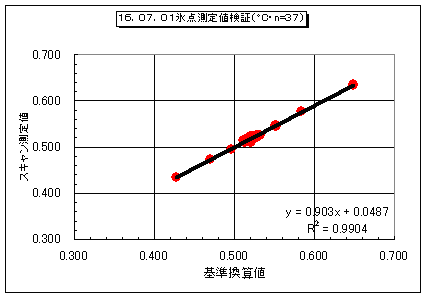 MilkoScan の測定精度を検証するために,酪農家の任意バルク乳30本程度と強化サンプル6本を加えて AdvancedOsmometer3CUによる氷点換算値と MilkoScan4200uw の氷点測定値の相関を求め,高速測定機器である MilkoScan の精度維持の担保としています。16年7月1日に実施した MilkoScan4200uw 氷点測定値検証の結果を示しておきました。
