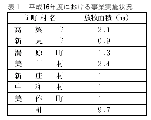 遊休農地への和牛放牧は,平成15年度調査時点で約16haの実施がありましたが,本年度は,当事業により新たに7市町村(約10ha)で実施されました(表.1)。