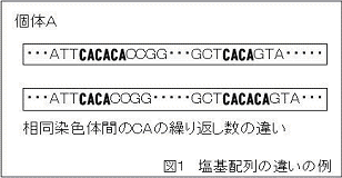 DNAの塩基配列のうち,個体によって配列や塩基の繰り返し数が異なる場所があり,相同染色体の間でも違いがあります。(図1)親子間で違いのタイプを調べることによって,染色体のその部分の由来,つまり父親の染色体のどちらを子が受け継いだかについて調べることができます。これを利用したものをDNAマーカーといいます。いわば,DNAマーカーは染色体上の特定の位置がわかっている目印のようなものです。