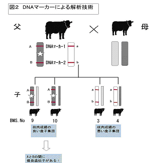 図2で簡単に原理を説明します。父の相同染色体にマーカー1とマーカー2を配置しました。それぞれのDNAの型を調べてみると,左の染色体は,マーカー1がA,マーカー2がB,右の染色体では,a,bとなっていました。次に産子について調べたところ,枝肉成績の良い集団はAとB,枝肉成績の悪い集団はaとbのマーカー型を持っているとすると,枝肉成績に関する優良遺伝子はマーカー型AとBの間に存在しているということになります。実際には遺伝子の組み換えが起こるため,もっと多くのマーカーを各染色体に配置して,その遺伝子が存在する領域を特定する必要があります。
