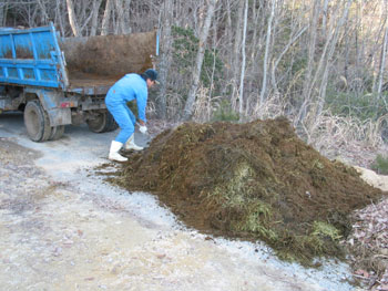 A一般的な酪農家のバーンクリーナー等で排出した搾乳牛のふんへ、モミガラ・乾草の残飼等を堆積時に人力で3割程度混ぜた物であまり高くは積めません。