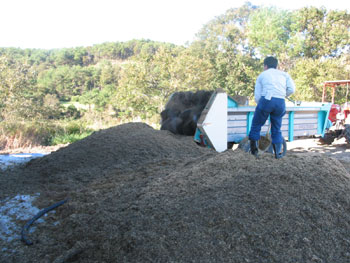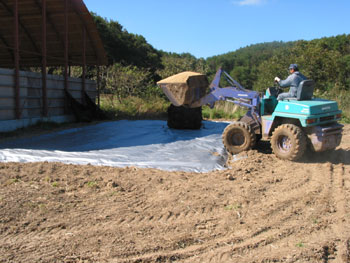 (2) その際、あらかじめシート上にモミガラを5p厚に敷き、さらに古い低水分牧草ベールをほぐし10p程度の層を作りました。