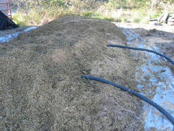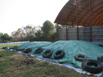 また、この牧草ベールで高さ50pほどの小山(芯)を造り、その上に調整した材料を積み上げた山(高さ1.2m程度)と通気管(暗渠排水用の資材を活用)を2本貫通させた山の2つを被覆シート(6×12m)で覆い、古タイヤで周囲を押さえました。