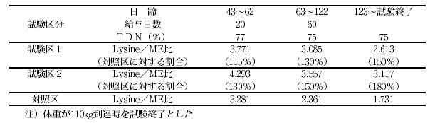 日本飼養標準・豚(1998年版)の要求量(対照区)に対し、表1のようにTDN(エネルギー)を一定にして給与ステージごとのLysine/ME比を高めた試験区(試験区1および試験区2)を設け、各区にB種の去勢豚および雌豚各7〜8頭を配置しました。