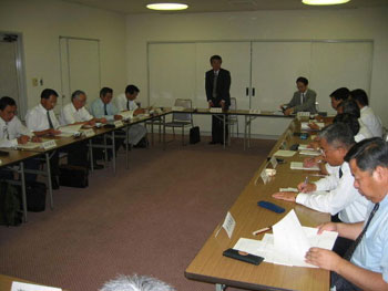 このような状況のもと岡山県では,繁殖雌牛の増頭をテーマとした肉用牛振興戦略の策定が急務であるとの観点から,岡山大学横溝教授を座長とする「岡山県肉用牛振興プロジェクト会議」を平成16年6月25日に設置しました(写真)。