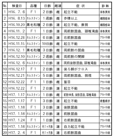 平成16年度,当家保管内において16戸 20頭(平成17年2月28日現在)の子牛について病性鑑定を実施しましたが,下記のような結果になりました。そのうちアカバネ病は12戸14頭と多発しており,主要な外貌所見は前後肢の屈曲,起立不能などでした。来年度の4〜5月までの続発が懸念されます。