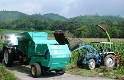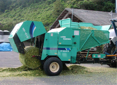 コーンハーベスタで収穫・細断したトウモロコシをロールベールに成形するもので、@ロスが少なく、高品質で安定したロールベールサイレージの調製、A収穫・調製作業の少人数化、Bサイロ詰め等の重労働の軽減、C天候の急変への対応などを目的に平成8年度から生物系特定産業技術研究支援センターで研究され、平成16年4月に市販された機械です。(図1)