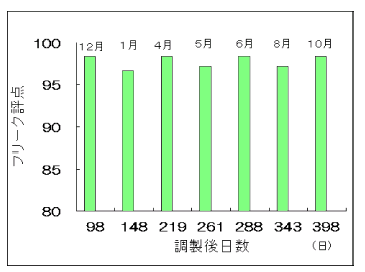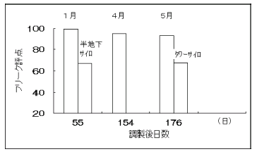 14ヶ月間保存した場合の評価は全期間を通じて「優」で、良好な状態が維持されました(図3)。さらに、平均気温が30℃を超え、酵母やカビの増殖が活発になり、二次発酵が起こりやすい8月でも細断型ベーラを用いたものでは、評価が優でした。つまり、未開封であればほぼ1年間は良好な品質が維持されたことから、良質サイレージの通年給与が可能であると考えられました。