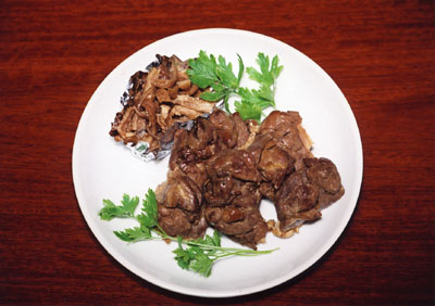 A皮:肉から剥がした皮は細く切りそのまま食べてもよいが,ネギの細かく切ったものと一緒に炒め,さらにご飯を入れ炒め,Bの煮汁を少し入れ味を整えると美味しいチャーハンの出来上がり。