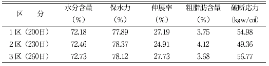 胸最長筋(ロース芯)の粗脂肪含量は1区が3.75%,2区が4.12%,3区が3.68%であり2区が高くなる傾向がみられました。近年,筋肉内脂肪含量の低下は豚肉の硬さを増し,風味や多汁性を減少させ,2.5%以下だと味が劣り,一方,筋肉内脂肪含量が増すと柔らかさ,風味,多汁性といった食味が向上するとの報告があります。今回,全ての試験区で胸最長筋の粗脂肪含量が2.8%以上であったことは,いずれの試験区も食味性に優れた豚肉であったと考えられました。破断応力は1区が54.98kgw/f,2区が49.36sw/f,3区が56.77sw/fであり,2区が低くなる傾向がみられました(表1)。これらの成績から,2区の豚肉が1区および3区より柔らかく食味性に優れた豚肉であると考えられました。