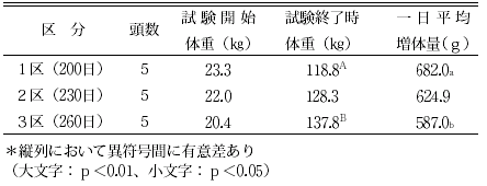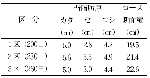 試験終了時体重は,1区が118.8s,2区が128.3s,3区が137.8sであり,3区が1区に比べて有意に大きくなりました。また,1日平均増体量は,1区が682.0g,2区624.9g,3区が587.0gであり,今回の試験では3区が1区に比べて有意に小さくなりました(表2)。山口らは,出荷体重と正肉歩留りを調査し,出荷体重は100sから110sにするのが得策であると報告しています。そして,今回の2区および3区の試験終了時体重から推定される枝肉体重は(社)日本食肉格付協会の豚枝肉取引規格の上物の範囲を越えており,重量大により格落ちとなることが考えられました。ロース断面積は1区が19.5f,2区が21.4f,3区が22.6fであり,肥育期間が長くなるにつれて大きくなる傾向がみられました(表3)。