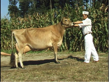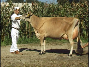 まずホルスタインですが,北海道は優等率76%(32/42頭),1等を含めた入賞率93%,12部門中8部門で首席を獲得,さらに最高位賞,名誉賞,準名誉賞を総なめにしました。最高位賞には前評判の高かった(有)福屋牧場のエルムレーン スカイチーフ サニー ET(10部)が受賞しました。また未経,経産とも岡山大会よりも大型化しており,各部の平均体高が未経で1.8〜4.5p,経産で0.5〜4p高く,未経では1部を除いた2〜5部で,最も体高の高い牛が首席をさらっています。