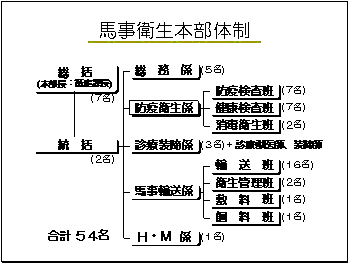 畜産課長を本部長として,県下5家保を主体とした54名体制で図1のよう馬事衛生本部を組織しました。また,会場内に診療装蹄所を設置して,専門の診療獣医師,及び,装蹄師を配置し,大会期間中の参加馬の健康管理に努めました。