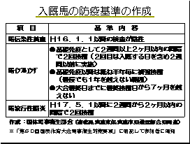 入厩馬の防疫基準は,畜産課,真庭家保,真庭市,県獣医師会,及び県馬連で組織する国体馬事衛生部会において,表1のように作成しました。この基準は,「第60回国民体育大会馬事衛生対策要項」に明記し,参加者に周知しました。
