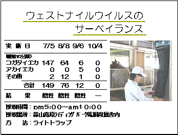 会場を管轄する真庭家保では,世界的拡大が懸念されているウェストナイルウイルスについてサーベイランスを実施しました。7〜10月の間,毎月1回,午後5時〜翌朝10時まで,蒜山高原ライディングパークの馬飼育厩舎内にライトトラップを掛けて雌蚊を採取し,病性鑑定所に送付しました。その結果,表2のように,イエカ属を主体として,7月には149匹採取されたもののその数は月を追う毎に減少し,10月の調査では採取できませんでした。また,ウェストナイルウイルスはいずれからも検出されませんでした。