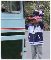 | <輸送係> 会場手前では、馬運車などの車両を一旦停止させ、確認した後、混雑状況をみながら会場内への誘導を調整 |