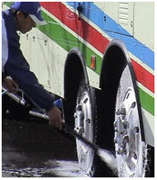 | <消毒衛生班> 会場入り口で車体を消毒 |