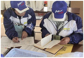 | <防疫検査班> 会場入り口で馬運車に積載している馬の健康手帳及び乗馬登録証を預かり防疫検査を実施。これをクリアした後、馬や荷物を降ろすことを許可。事前に防疫基準確認を確実に実施していたため、入厩拒否する事態もなく、スムーズな確認作業 ができた。 |
