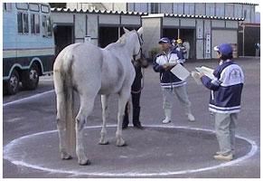 | <健康検査班> 馬運車から降ろされた馬は、健康検査班が乗馬登録証記載の特徴と照合するとともに、視診による健康検査を行い、確認後厩舎へ誘導 |