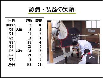 診療については,複数の競技に重複して出場する馬が,疲労回復等の処置を受ける例が多く,競技開始日以降から件数が増えました。(表3)