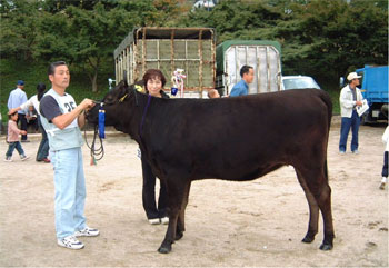 また平成13年の春の事でした。時あたかも第8回岐阜全共に向けた地元対策協議会において候補牛の選抜・飼育者の選定が進んでいる時,図らずも「第8区総合評価群種牛の部に」というお声をいただきました。若輩者をも省みず,天にも昇る気持ちでお引き受けする事にはしたものの,事の重大さに胸の鼓動と足の震えを抑えることが出来なかったのを覚えています。それからの一年余り,岐阜会場での最終審査に向けて,関係機関の方々の想像を超える指導を頂きながら日々の管理に没頭したものでした。
