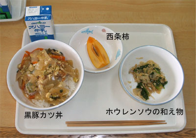 この日は町内の農家が育成した黒豚の肩ロース約21キロを使い「黒豚カツ丼」420食が用意され,同じく地元産のホウレンソウの和え物,地元産の西条柿と一緒に出されました。
