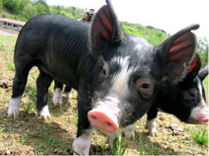 「おかやま黒豚」(バークシャー種)は28年前,鹿児島県から黒豚を導入し研究が始まり,平成8年から3年間はイギリスから優良な種豚が導入され,その後,県総合畜産センターを要に,黒豚の産地づくりと協議会組織による銘柄化がすすめられたものです。「おかやま黒豚」は,肉の繊維が細かく歯ごたえがあり,脂肪も独特の風味を持つのが特徴です。