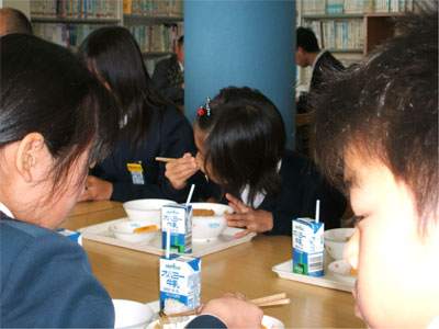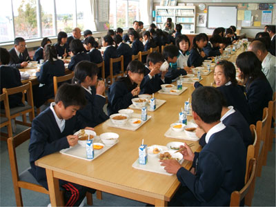 当日は,中井奈義町長も来校し,地産地消や地元の畜産などについて説明をした後,六年生63人と一緒に試食しました。
