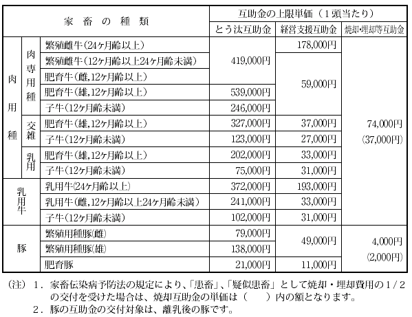 移動制限区域内等で家畜防疫員の指導等により家畜を「自主とう汰」したときに交付されます。