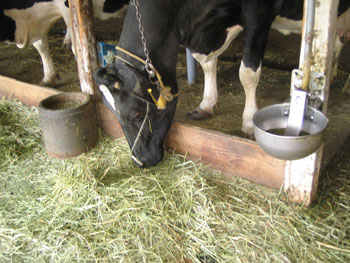 まず444 濃厚飼料4s4時間空け1日4回合計16s。以下,乾草は食べるだけ与えて,アシドーシスの改善から始めました。書くことは簡単ですが,ずぼらな私にとって苦痛でした,が,なんとかなりました。半年後,努力の成果で足のはれは少なくなりましたが,乾草を3sほど食べてくれません。繊維の長い物から順番に与えたり,給水場所の掃除{サイホン式},飼槽と牛床の仕切り板,ニューヨークタイストールなど改善しましたが,草を食べてくれません。たまたま,共済廃用しようとした牛をつなぎかえたら,日増しに健康になり,先生も私もびっくり。給水場所の毎日の掃除のおかげで水の噴出量が1番多いいところでした。すぐに最新式のO社のウオーターカップとO社による配管設計で設置しました。牛達も喜び草の量もまずまず食べてくれました。2年間悪戦苦闘でしたが,とてもいい体験になりました。今で言うカウコンフォートです。それから1年後,三村ドクターに見てもらい「牛が健康になりました」の言葉をもらい,確かに第4胃変位,乳房炎,低Ca症など,病気も激減しています。平均乳量も30s近くになり,初産牛も最高乳量で30s以上出るようになりました。