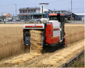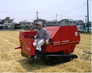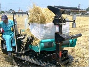 平成18年6月3日に岡山市農協所有の面積約45アールの麦ほ場において,収量,作業時間,収集ロス等について調査しました。麦わらは,当日収穫されたビール用の二条大麦(ミハルゴールド)でした。収集には,接地圧が低いクローラタイプのT社製自走式ロールベーラ(SR900)(写真1)(以下,ベーラ)および自走式ラッパ(SW1010W)(写真2)(以下,ラッパ)を用いました。