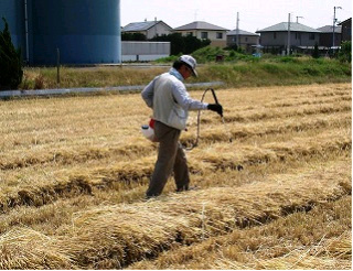麦わらの収集形態は,ベーラの収集ロスを少なくするために主として長わら(無切断わら),対照として切断わら(切断長15p)としました。また,サイレージ化しやすいように市販の乳酸菌添加剤(繊維分解酵素入り)をロール前に電動噴霧器により添加しました(写真3)。
