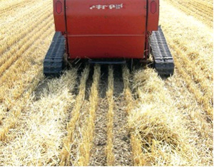 今回は,試験計画時に切断した麦わらは拾いにくいと考え,主として長わらによる収穫を行いました。しかし,切断幅15p(機械設定)でも,コンバインからの吐出幅を狭めることによりロスが少なく収集できることが確認されました。