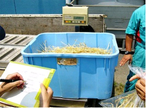 |  (写真4−1)コンバインからの吐出状況 |  (写真4−2)材料草調査風景 |