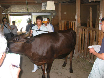 6月末に県下トップを切り,新見市出品対策協議会(会長:二摩紀昭JA阿新組合長)が種牛の巡回調査を開始しました。去勢肥育牛については前年度から育成段階での調査を行い,挙N多和牛牧場,JA阿新千屋肥育センターで肥育しています。
