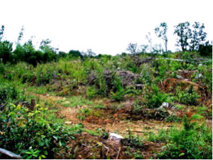 今回の実証展示圃場は,勝央町美野地区の山林で,面積は7,584uです。ここは樹齢40〜50年のヒノキ植林地でしたが,台風23号によって壊滅的な被害を受けました。地主さんも倒木の後片付けや,苗木の植樹はされたものの,それ以後の管理までは手が回らず,折角の苗木も雑草に覆われていました。