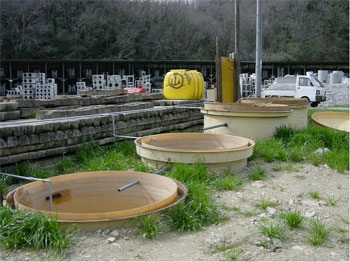 曝気槽は中古のFRPサイロ(5.9k×4基=23.6k)を利用し,ロータリーブロア(0.75kw,