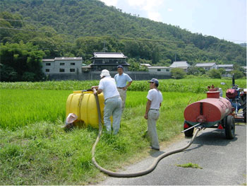 飼料イネには代かき時の基肥に1.5t/10a,出穂前の追肥に2t/10aを,また食用水稲には追肥として2t/10aを水口から流入施用し,現在,農業総合センターや総合畜産センターと協力して調査を行っています。