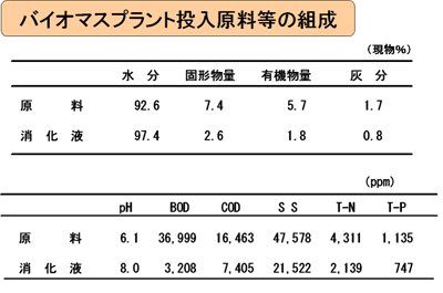 原料(豚ぷん尿と生ゴミ)の固形物量は7.4%,有機物含量は5.7%であり一般的なふん尿混合物の濃度と同程度の数値です。